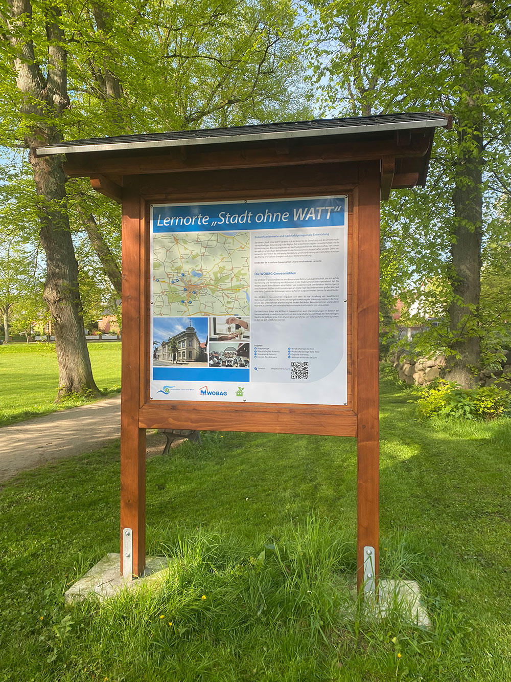 Die Lernortafel befindet sich im Park der Bürgerwiese, hinter den Häusern der August-Bebel-Straße 44/46 in 23936 Grevesmühlen.
